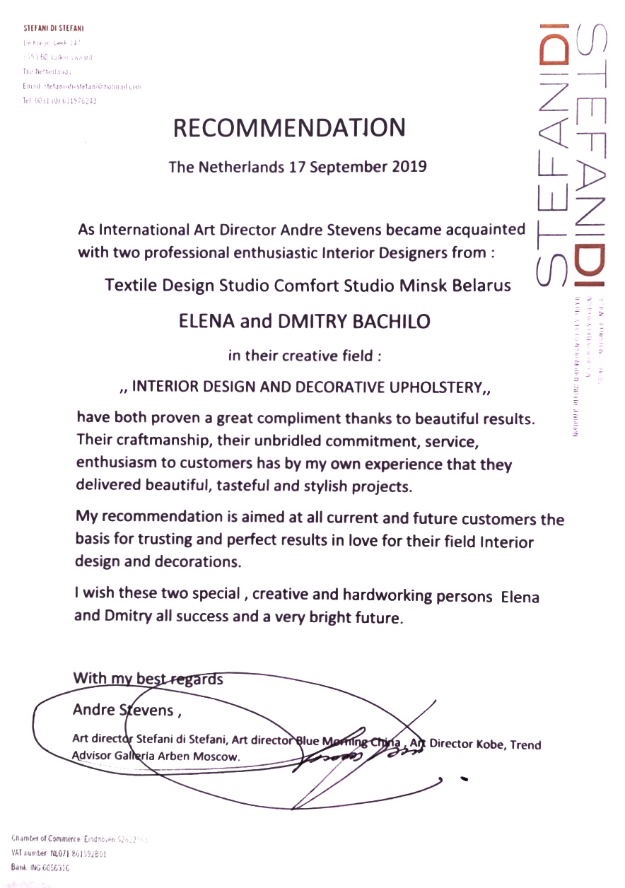 Do 2013 roku zrozumieliśmy, że potrzebujemy nie tylko zakładu, ale również własnego salonu z kolekcjami tkanin. Przenieśliśmy się więc do inkubatora przedsiębiorczości pod Mińskiem, gdzie otworzyliśmy showroom z próbkami tkanin i karniszy, a także powiększyliśmy zespół krawców do ośmiu osób. Jakość zawszebyła naszym najważniejszym priorytetem.